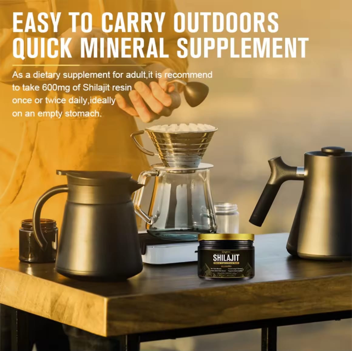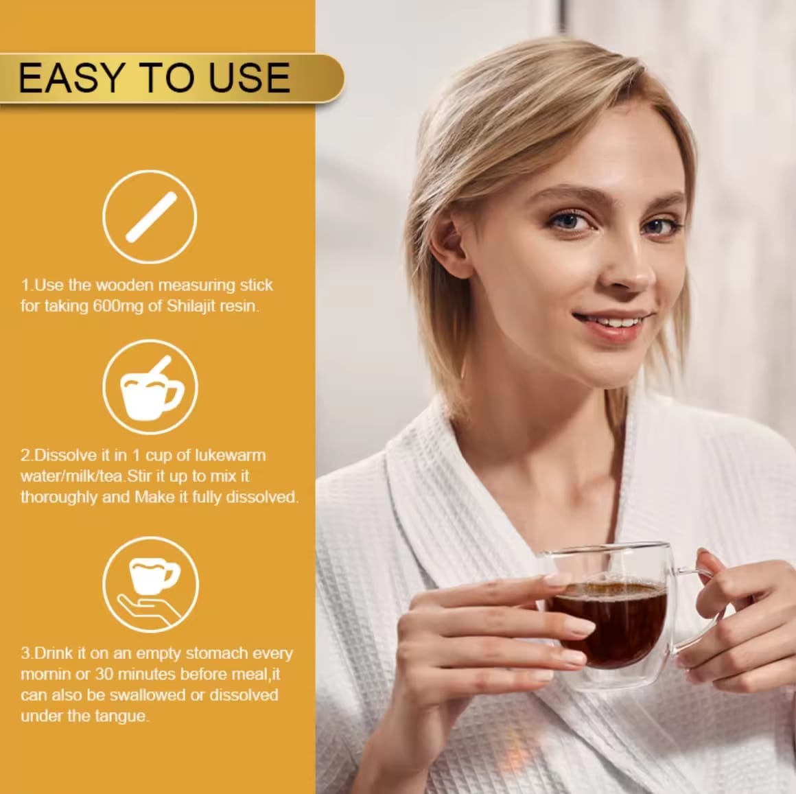 2. Pour shilajit resin into water, tea or favorite beverage.